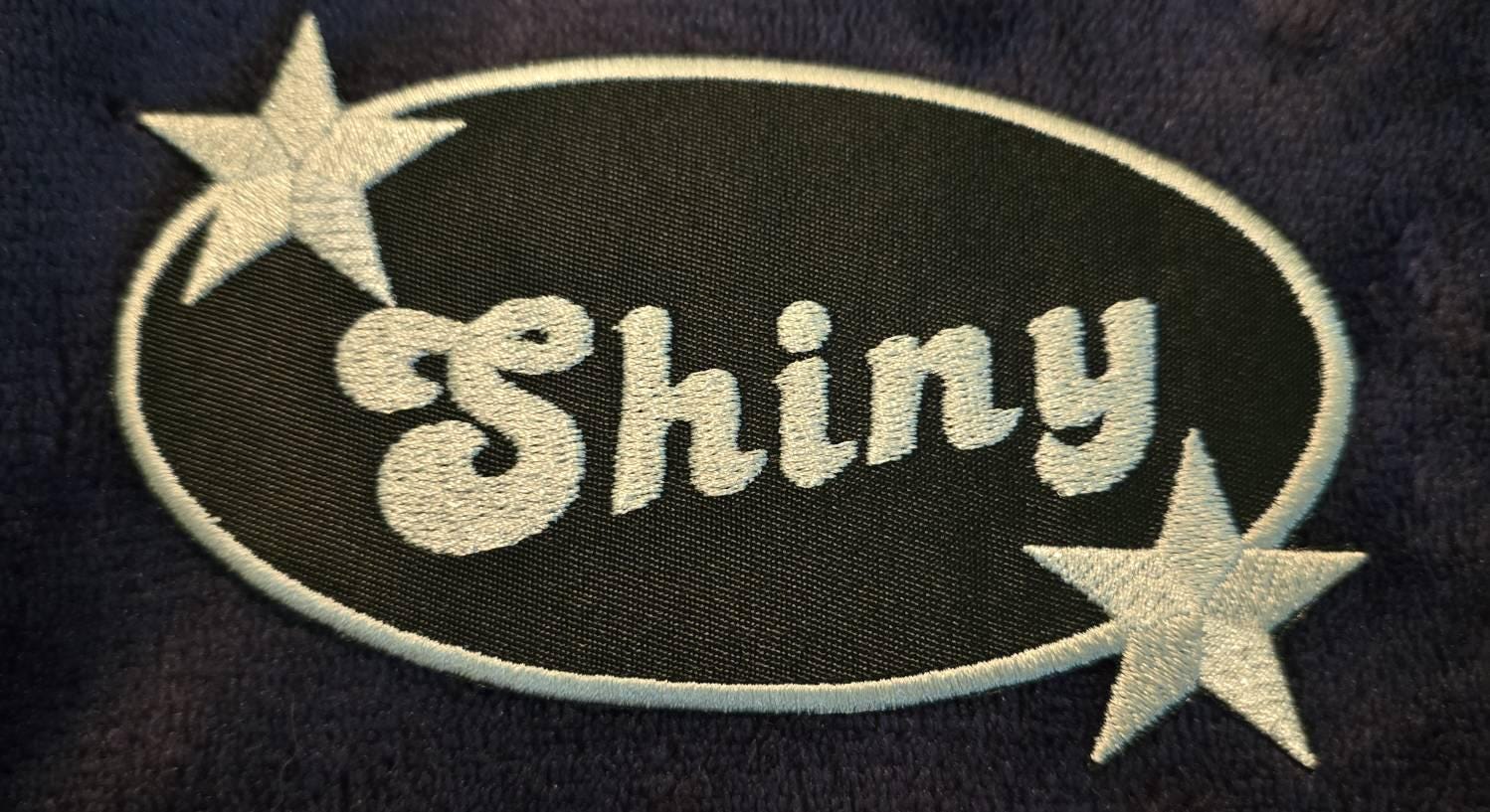 The Shiny Patch is 5 inches wide by 3 1/2 inches tall. The lettering, oval and stars are embroidered in silver thread. You can iron on this patch onto apparel or tack it on.