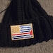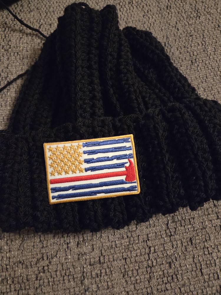 This nice looking firefighter flag patch is sewn with gold stars and gold trim, royal blue stripes, and red axe onto a white patch background. It measures approximately 3"W X 2"H and has an iron on adhesive to help with application.